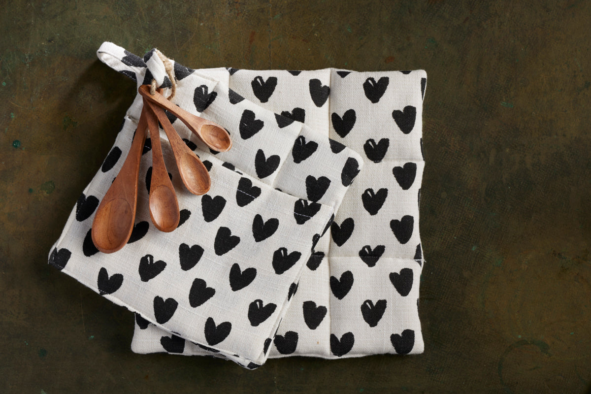 Pot Holders with Spice Spoons - Hearts - Ivory / Black