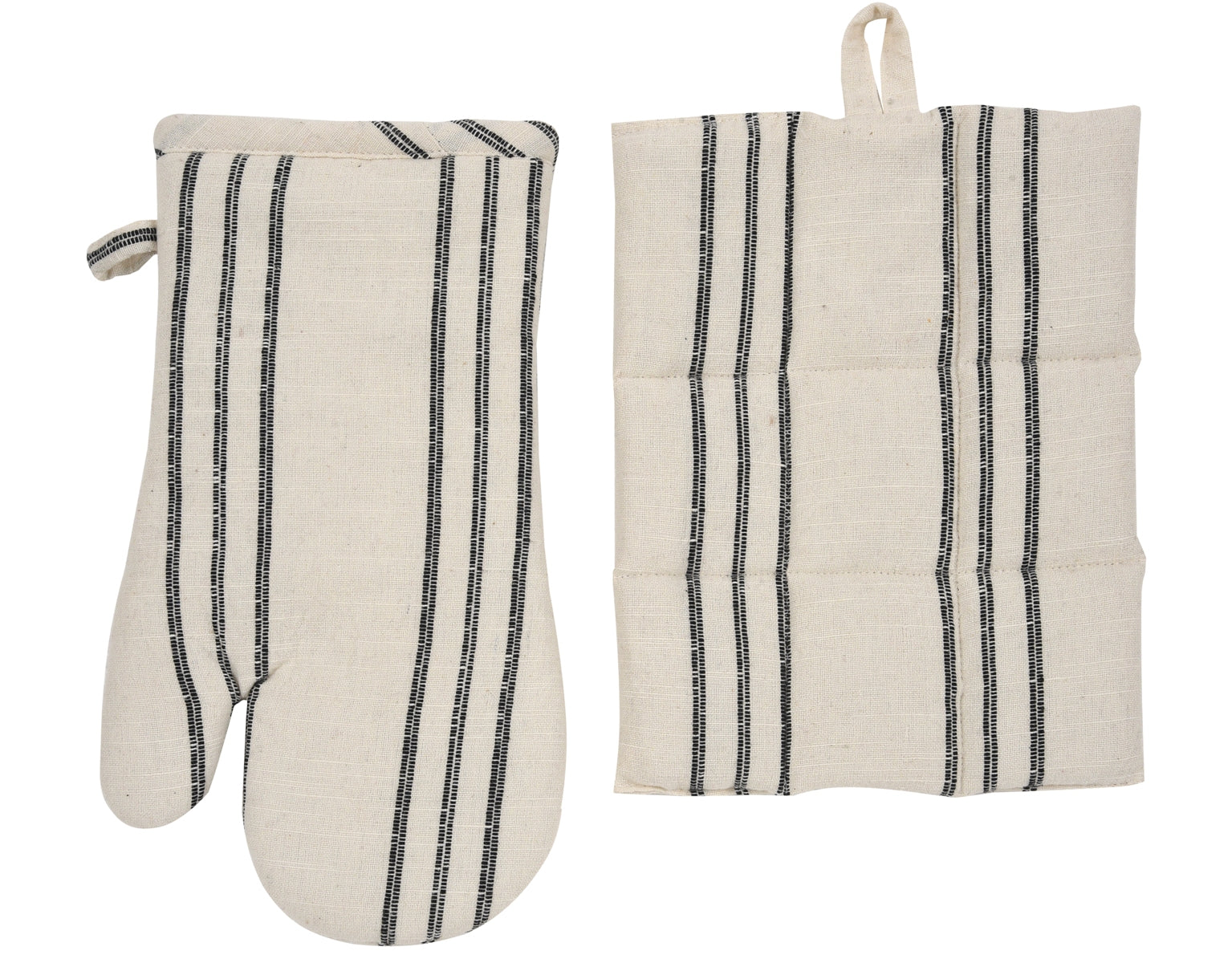 Oven Mitt, Pot Holder with 4 Spice Spoons Set - Slub Stripes - 100% cotton - Ivory / Black