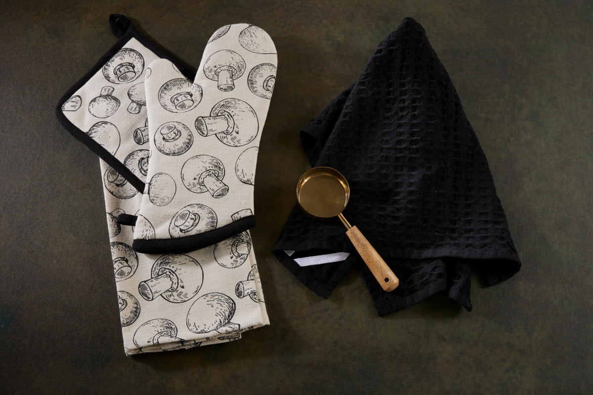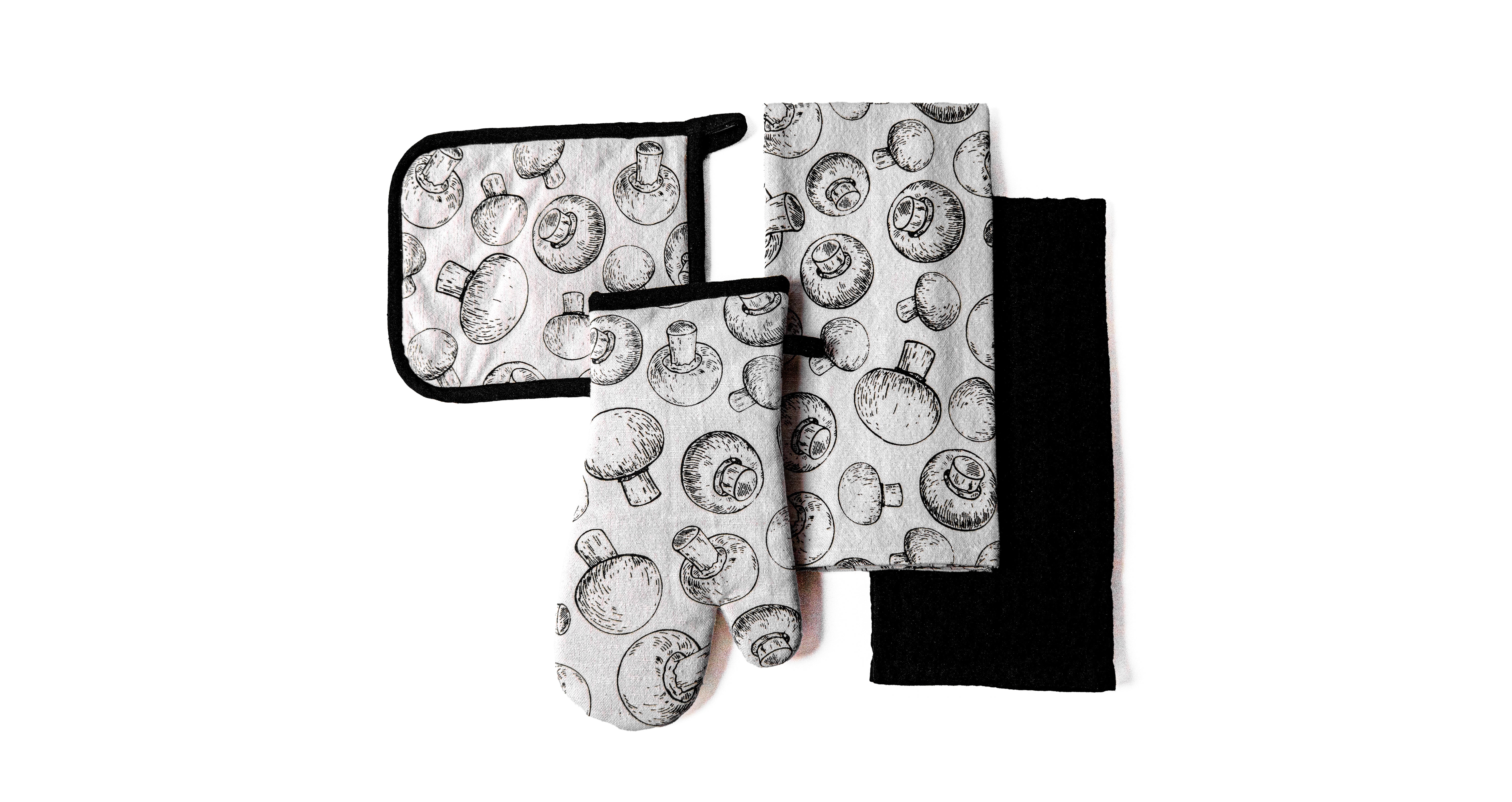4 Pc Baking Set -Premium Cotton Printed Mushroom - 100 % Cotton - Ivory / Black