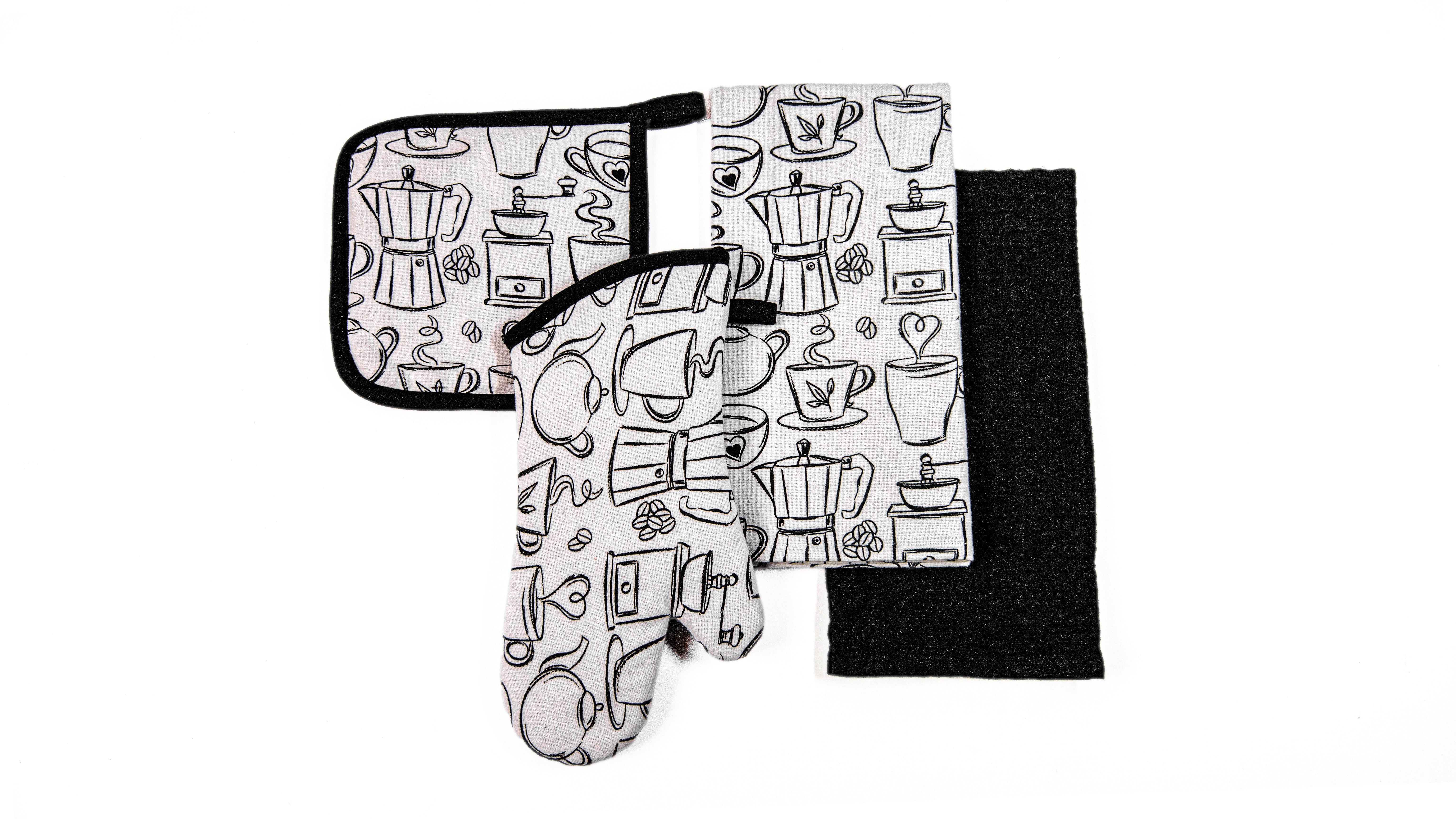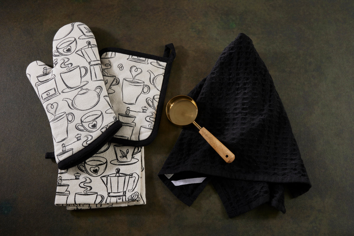4 Pc Baking Set -Premium Cotton Printed Coffee - 100 % Cotton - Ivory / Black