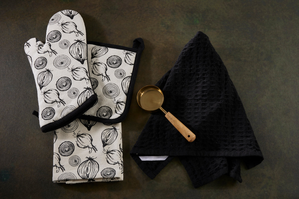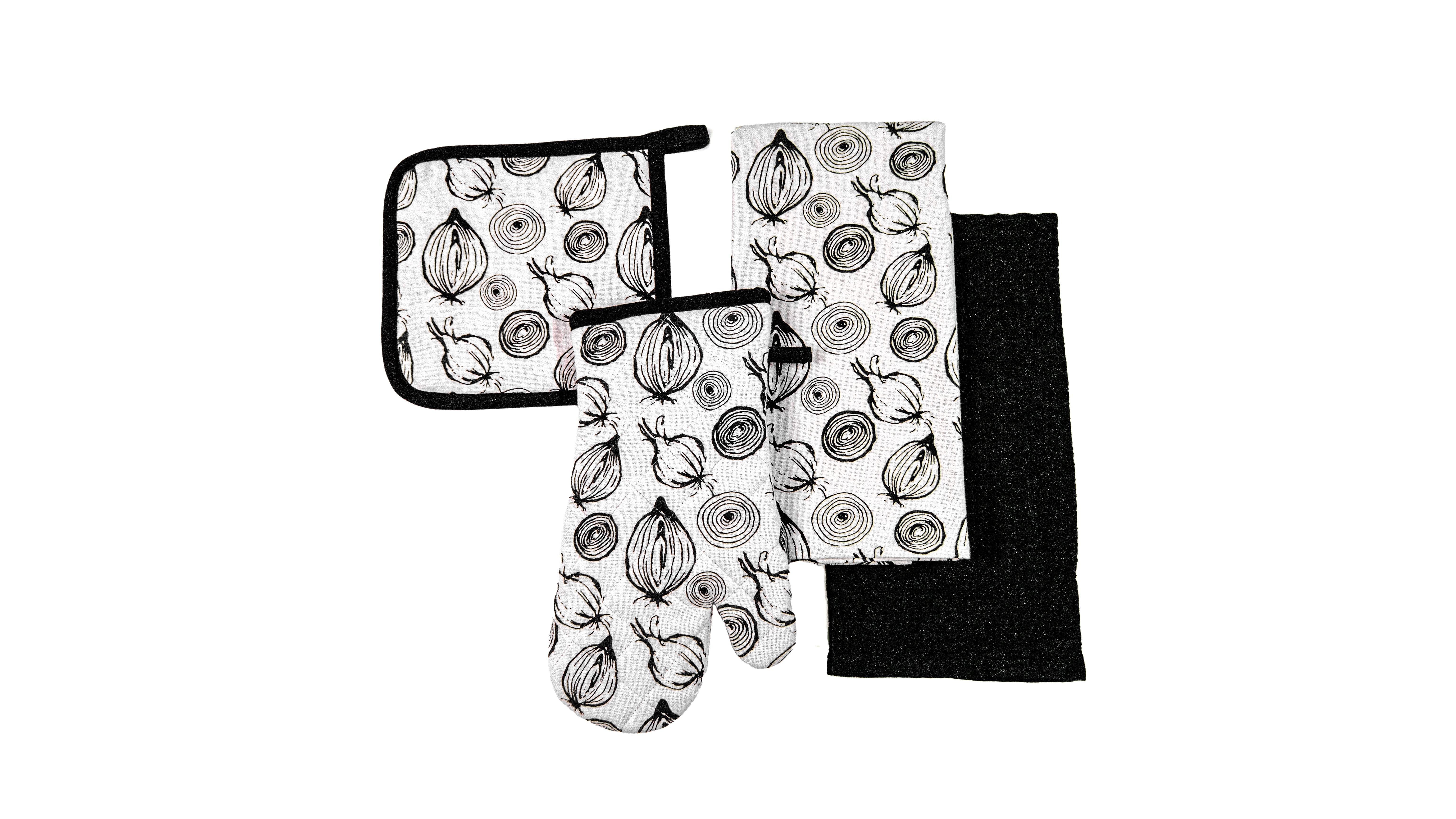 4 Pc Baking Set -Premium Cotton Printed Onion - 100 % Cotton - Ivory / Black