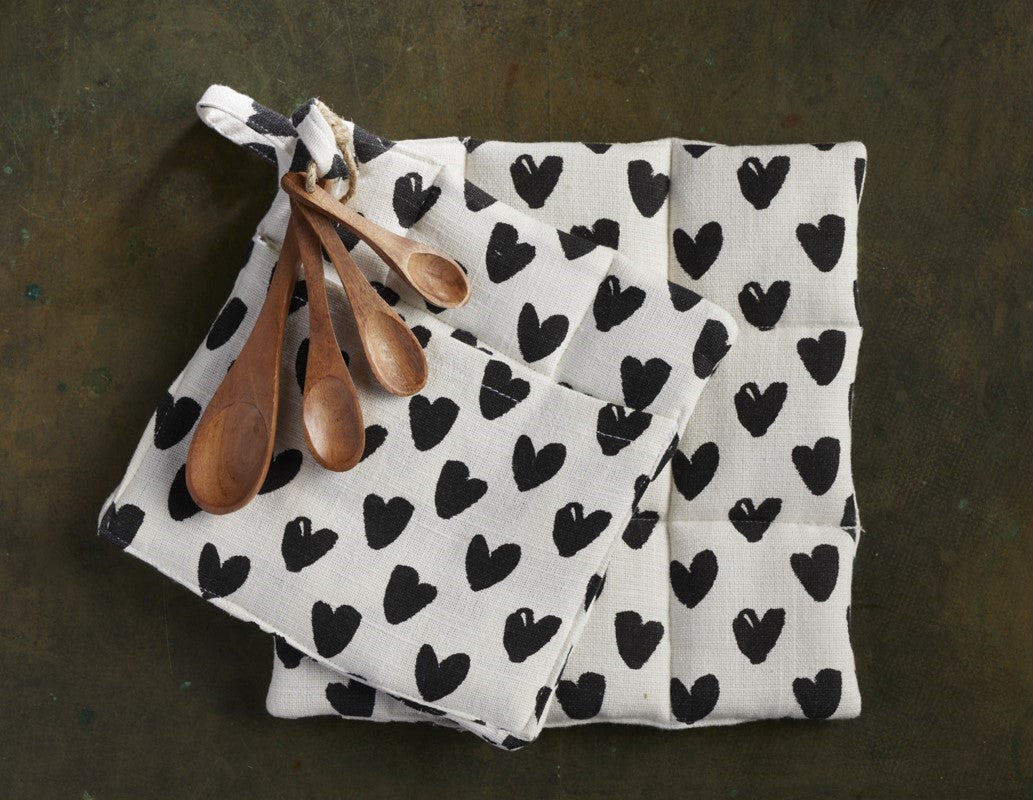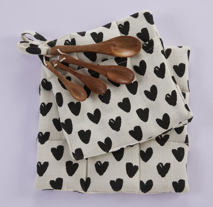 2 Pot Holder With 4 Spice Spoons Set - Premium Cotton Printed Hearts - 100 % cotton - Ivory / Black