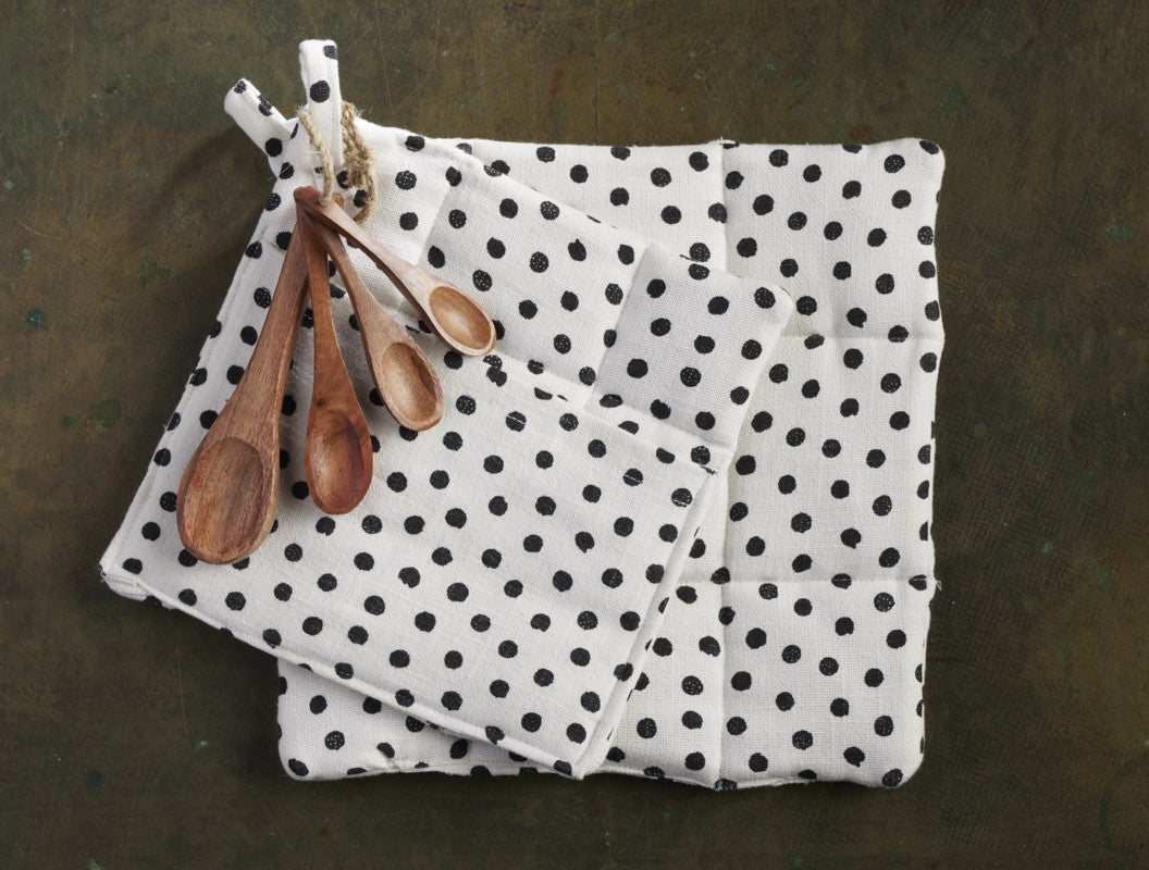 2 Pot Holder With 4 Spice Spoons Set - Premium Cotton Printed Polka dot - 100 % cotton - Ivory / Black