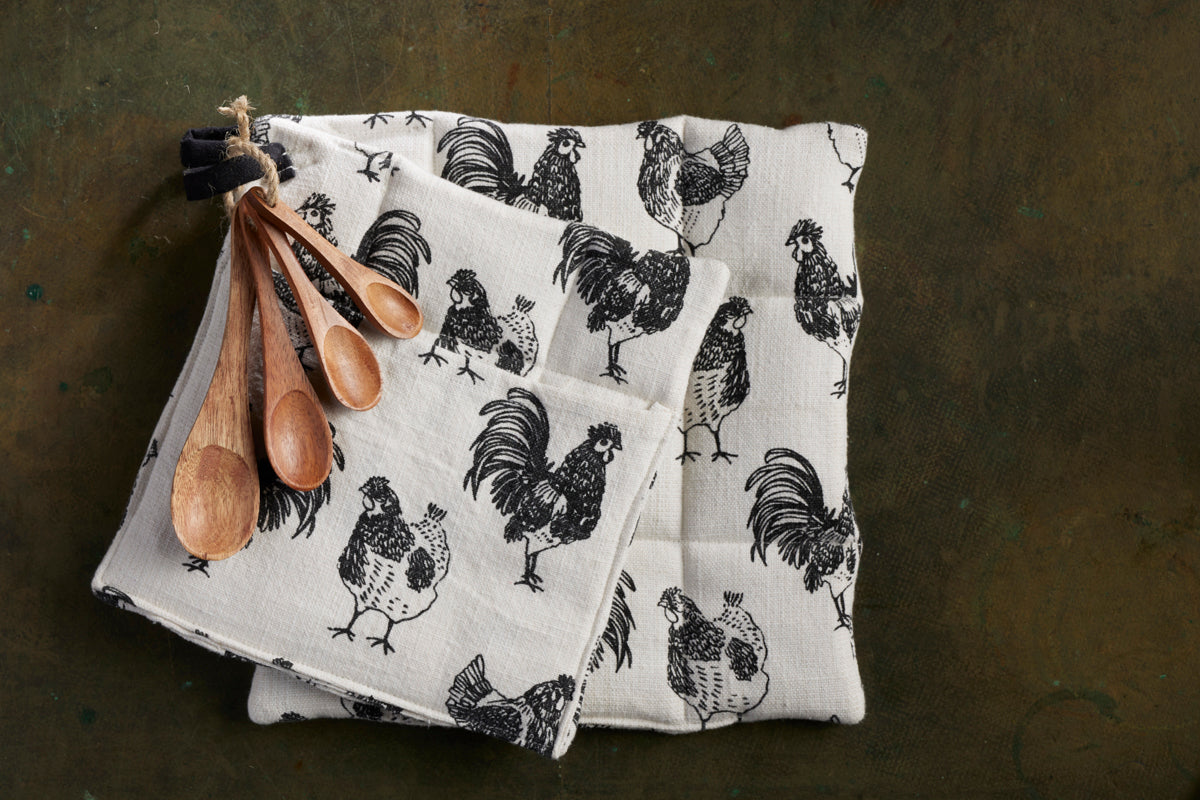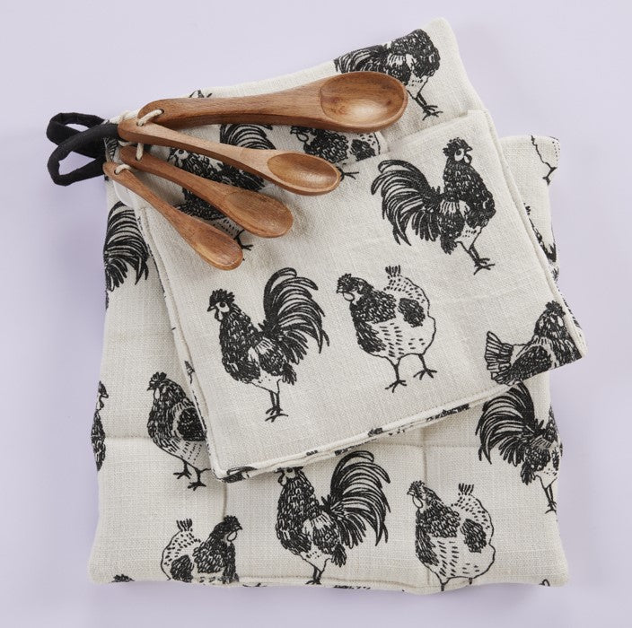 2 Pot Holder with 4 Spice Spoons Set - Premium Cotton Printed Rooster - 100% cotton - Ivory / Black