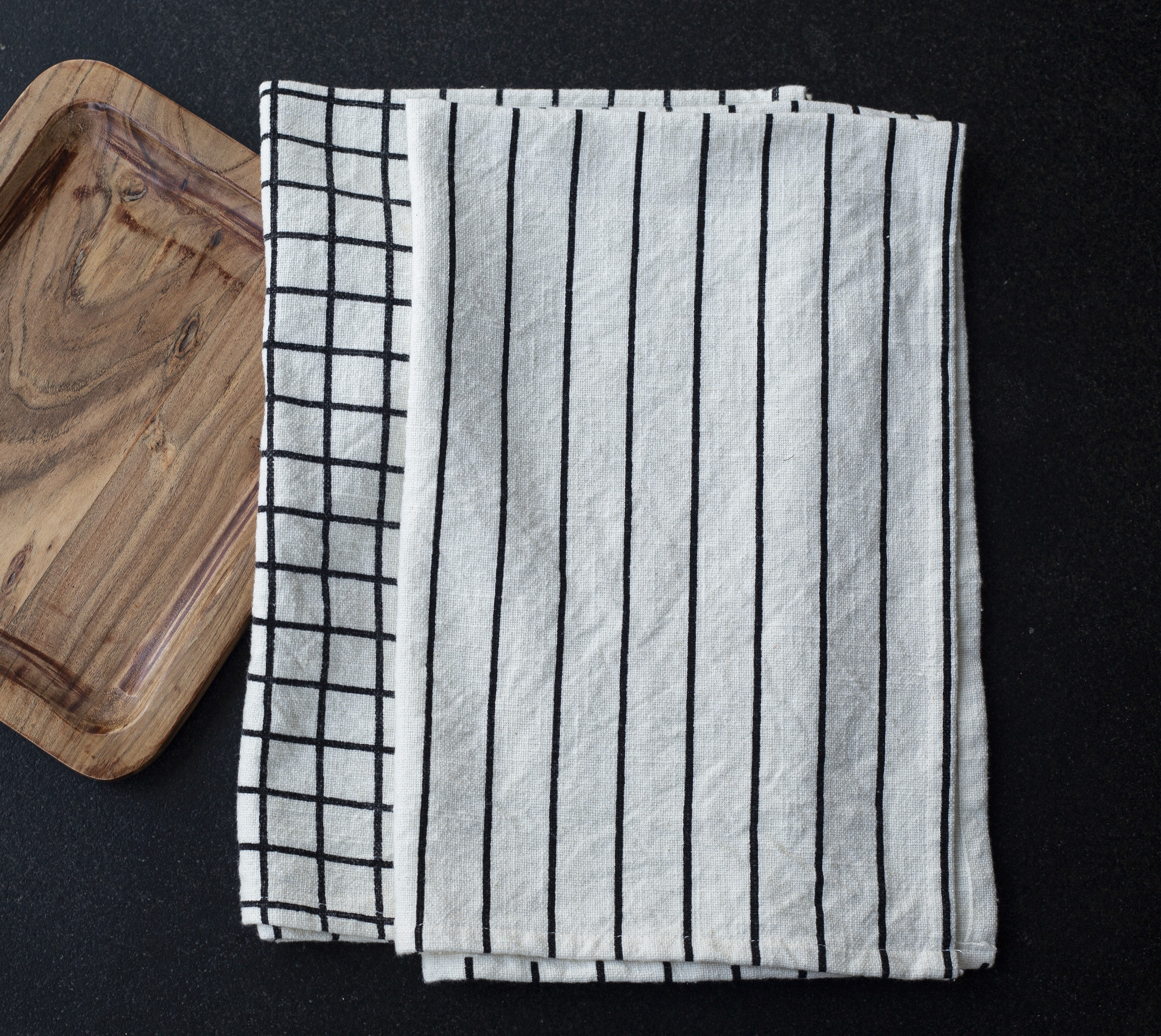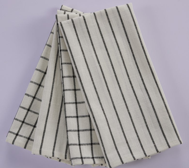 Pantry Towels - Cotton Stripes & Checks Multi Pack - Set Of 4 Kitchen Towels - 100 % Cotton - Ivory / Black