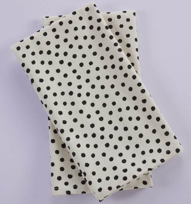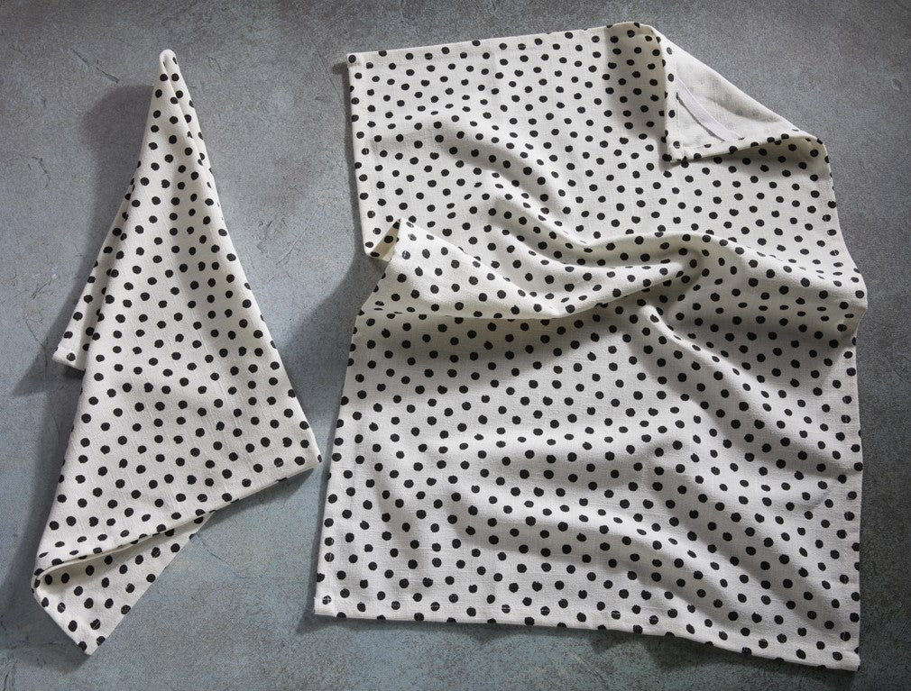 Premium Cotton Printed Towels - Polka Dot Print Set of 2 Kitchen Towels - 100 % Cotton - Ivory / Black