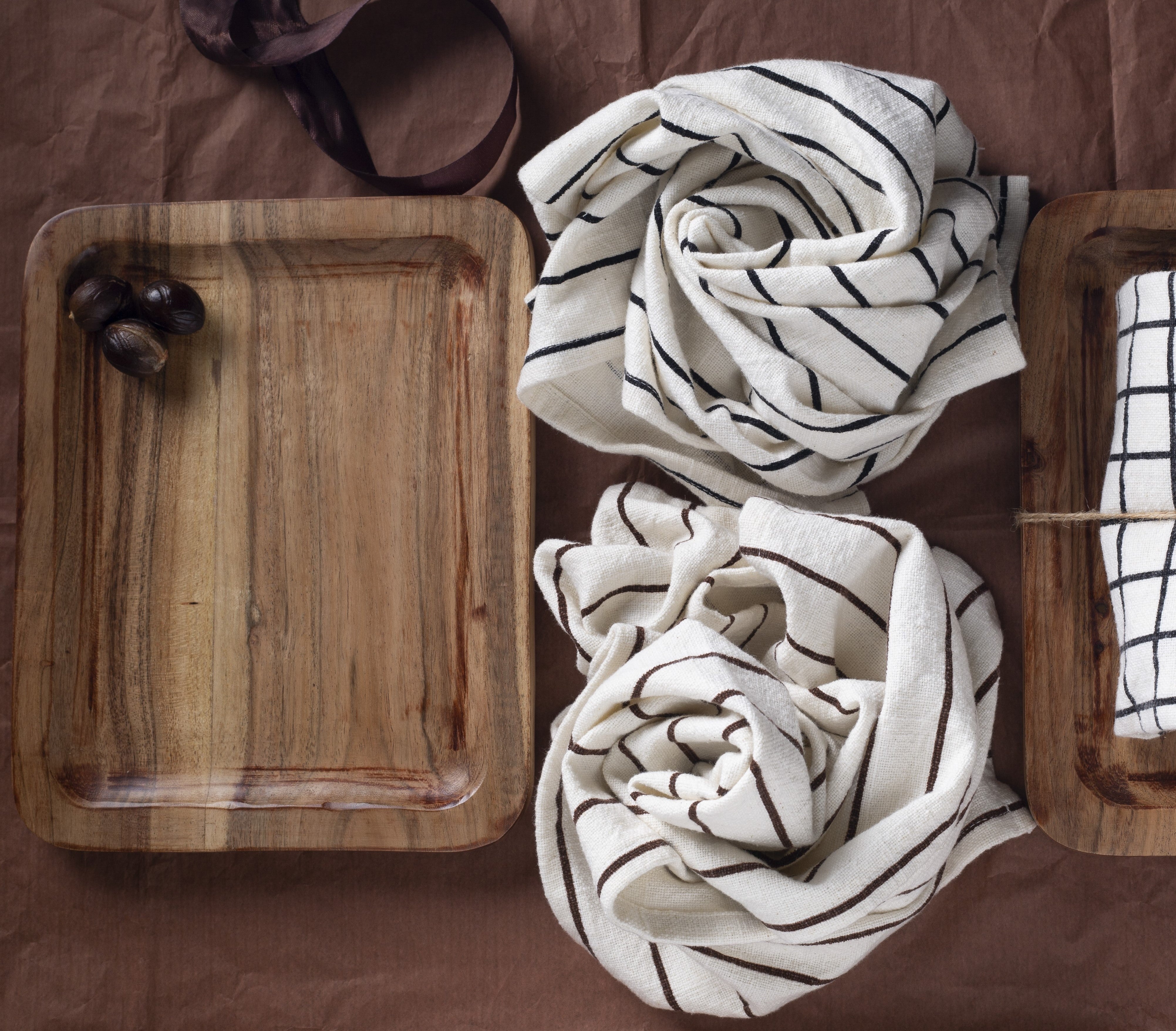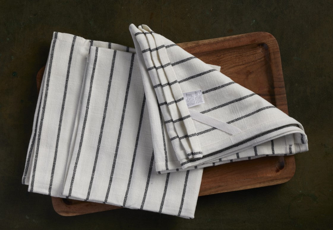 Kitchen Towel With Wooden Tray - 100 % Cotton Stripes- Ivory / Black