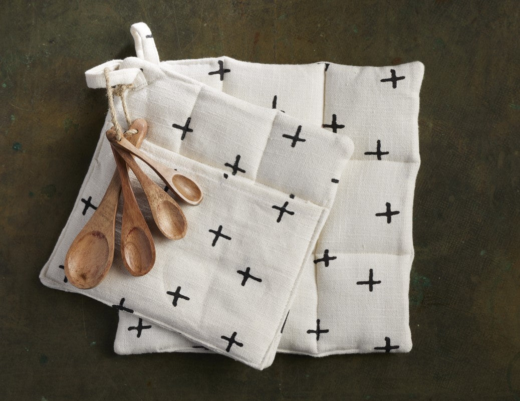 2 Pot Holder With 4 Spice Spoons Set - Premium Cotton Printed Plus - 100 % cotton - Ivory / Black