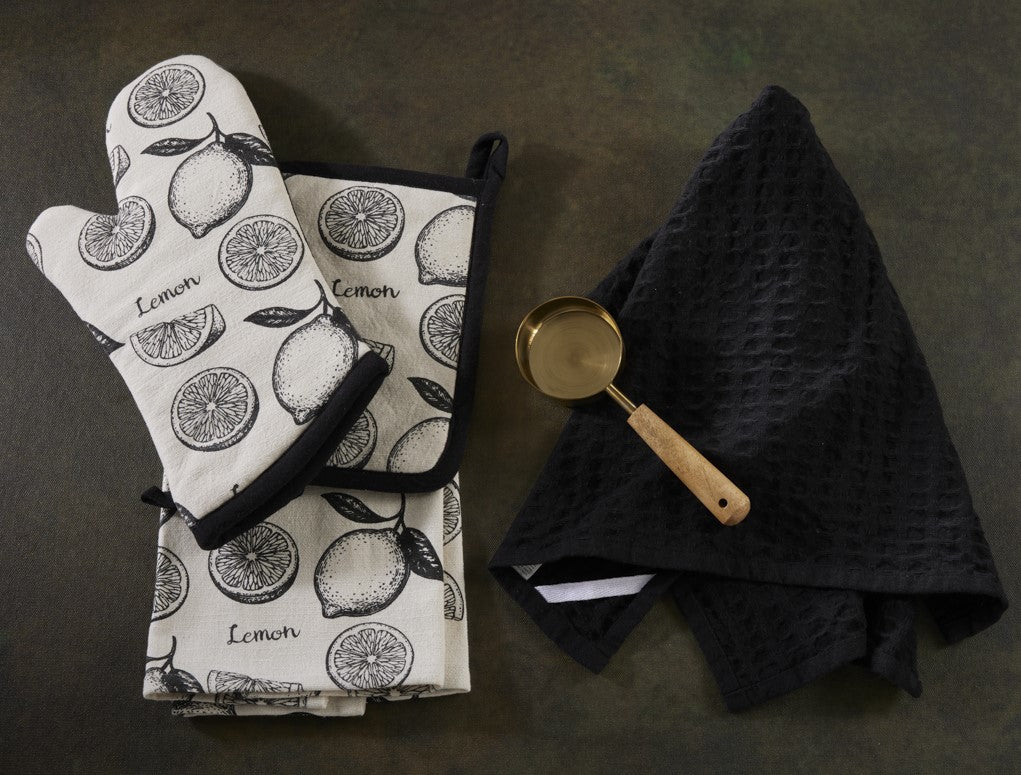 4 Pc Baking Set -Premium Cotton Printed Lemons - 100 % Cotton - Ivory / Black