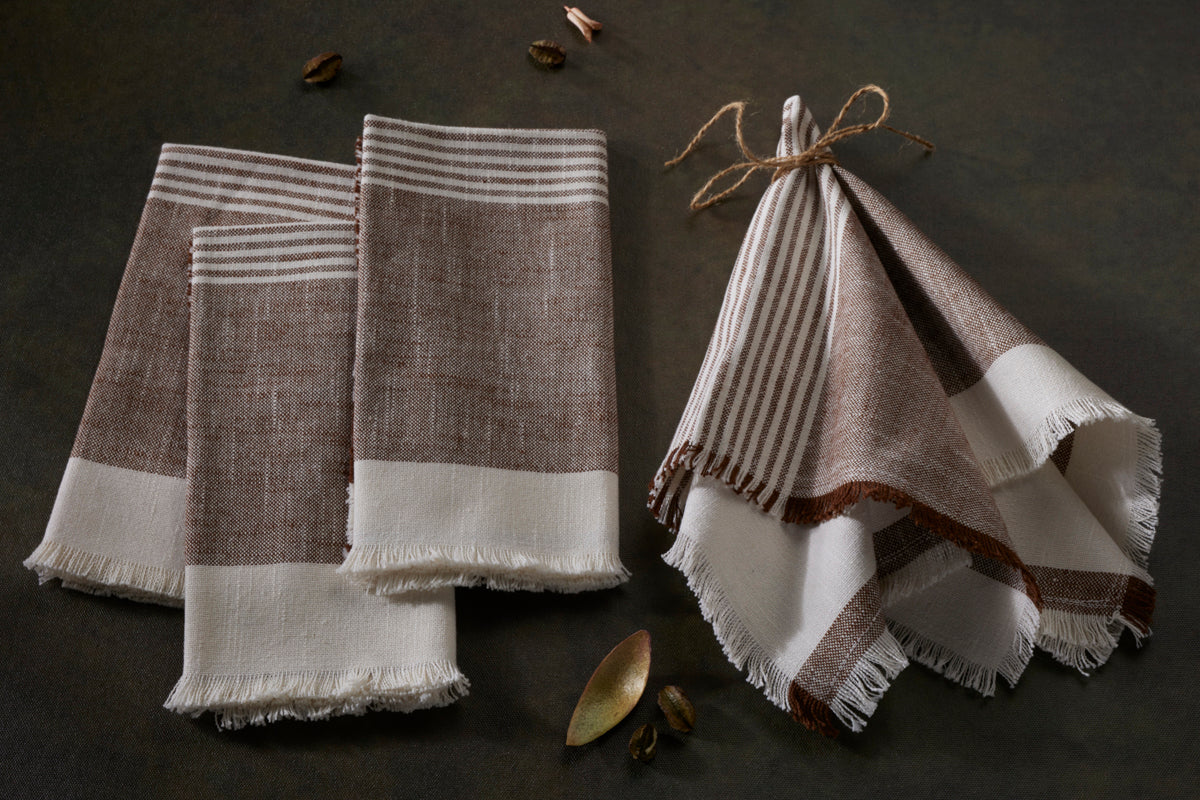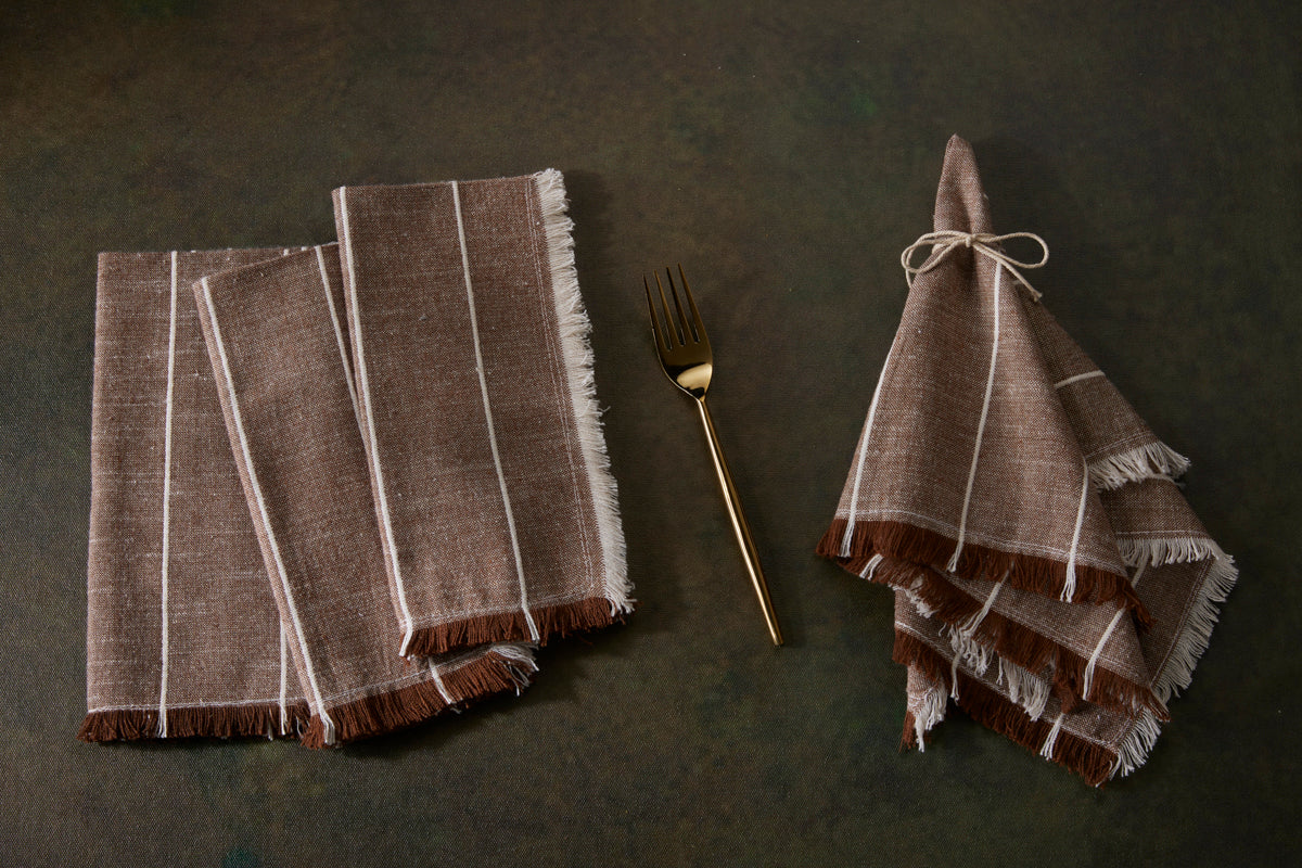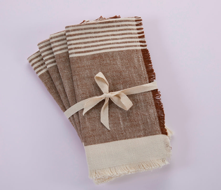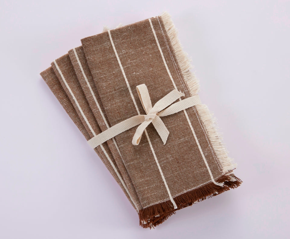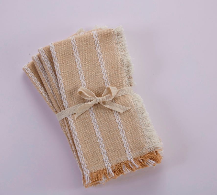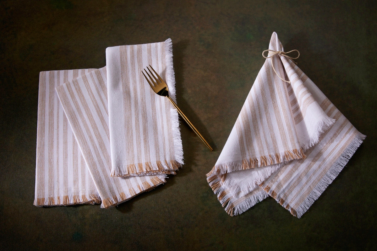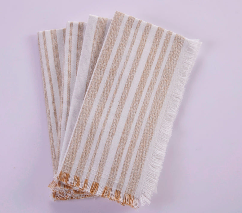 Stripe Fringe Napkins - Set of 4 - 100% Cotton - Tan